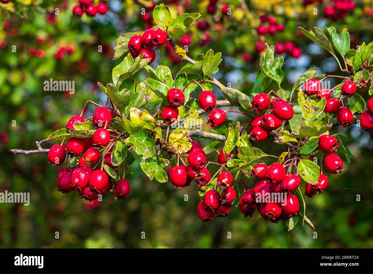 Large Hawthorn Bush with Bright Red Berries in Autumn Stock Photo