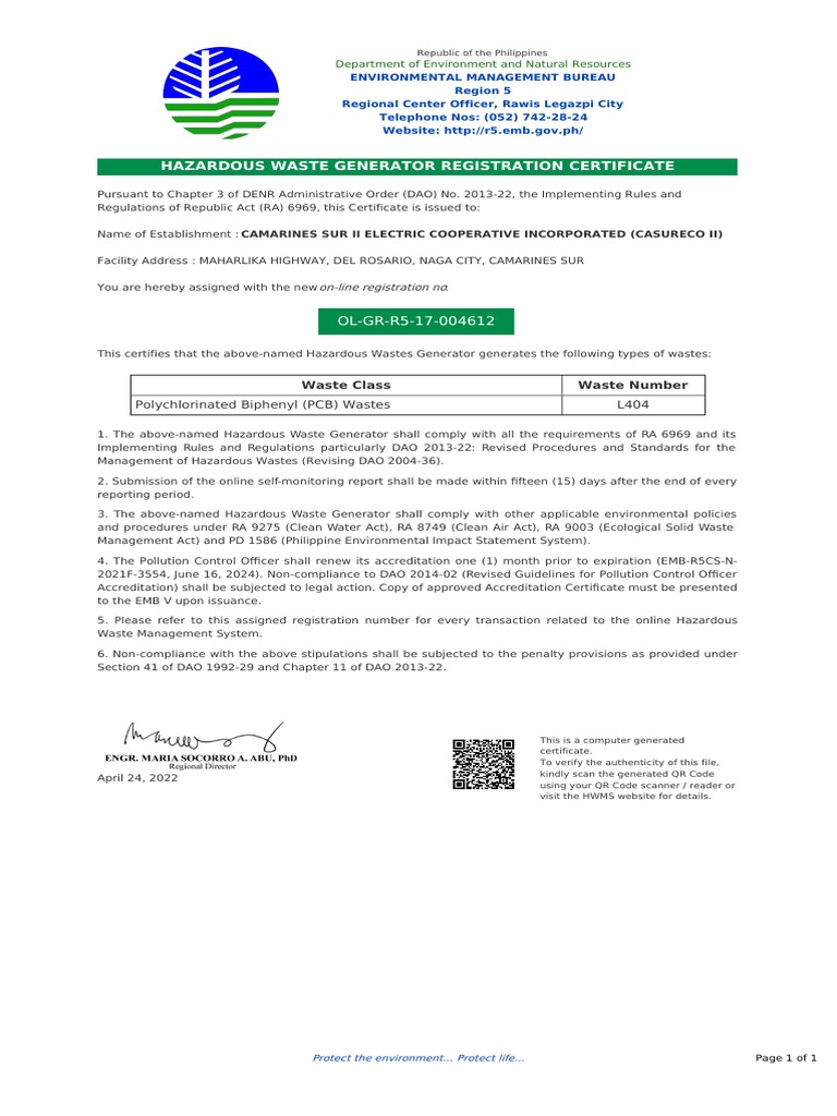 Hazardous Waste Generator Registration Certificate: OL GR R5 17 004612