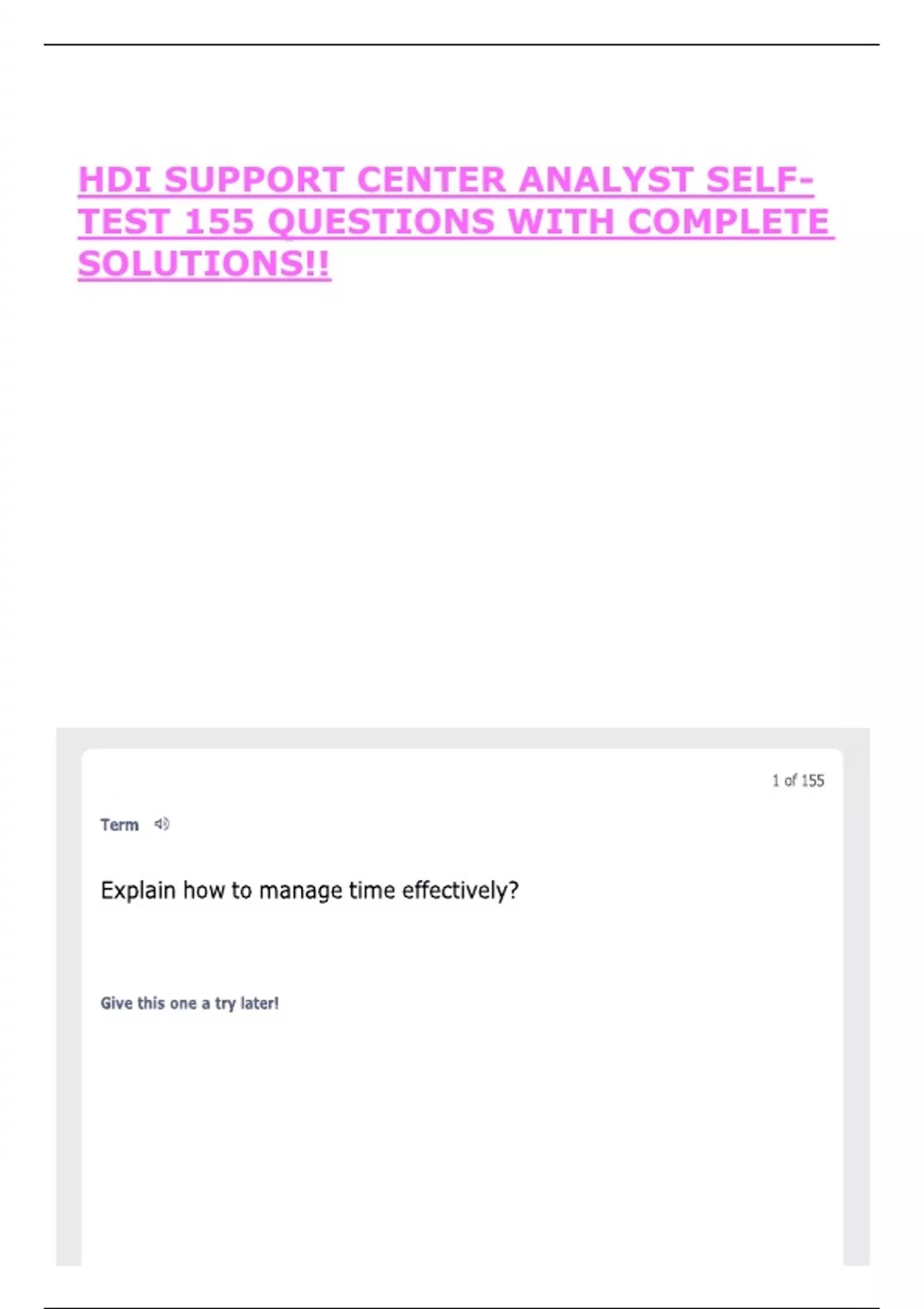HDI SUPPORT CENTER ANALYST SELF TEST 155 QUESTIONS WITH COMPLETE