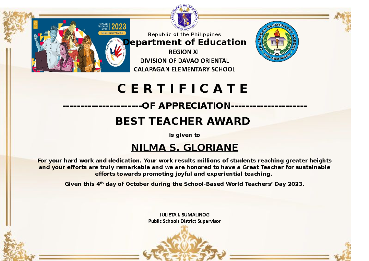 CERT FOR Teachers DAY Department of Education REGION XI DIVISION OF