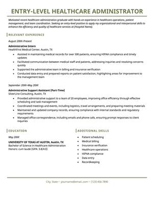 Entry Level Healthcare Administration Resume Templates at