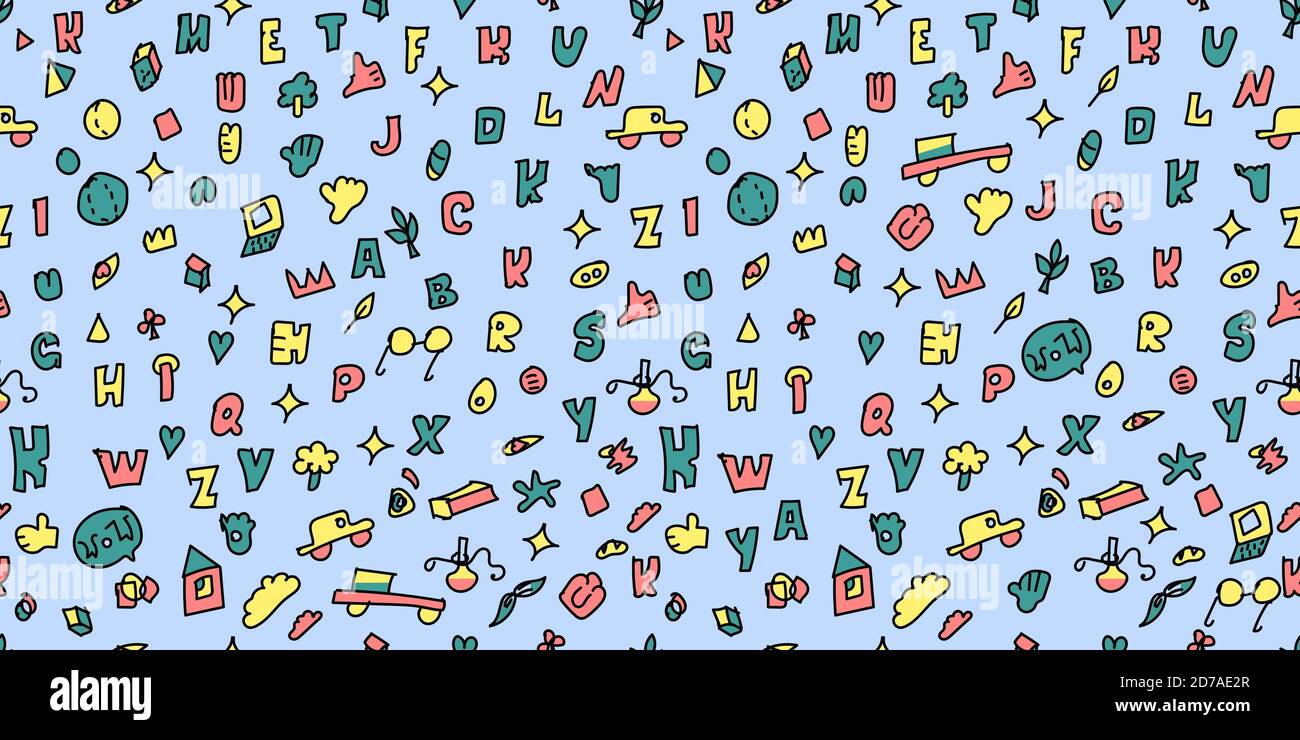 Seamless repeat pattern which consists of alphabet car glasses heart