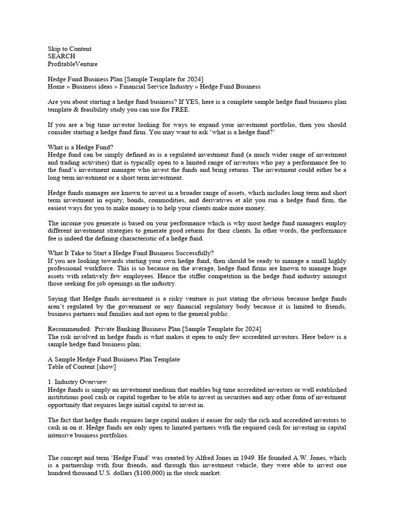 Hedge Fund Business Plan PDF Hedge Fund Investment Management