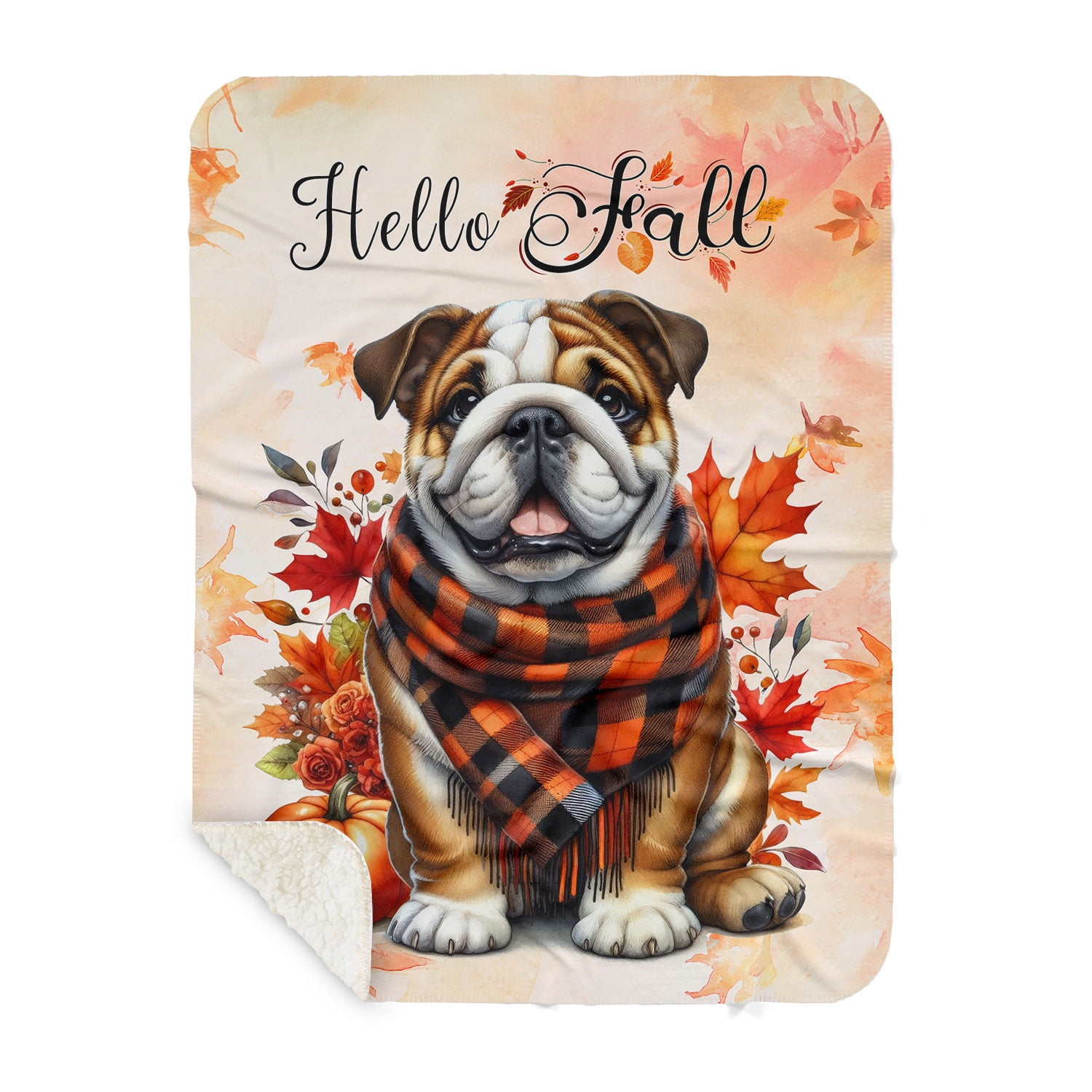 Hello Fall Bulldog Scarf Welcome Autumn with Leaves Pumpkins Cozy