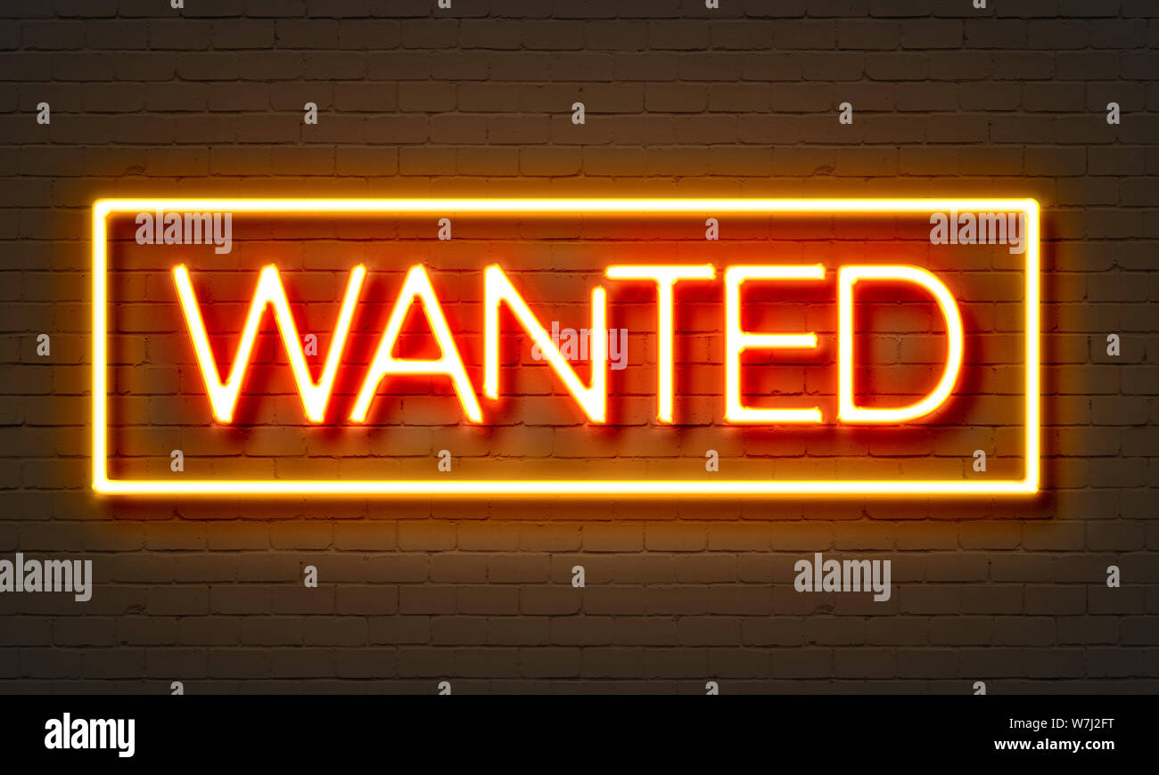 Wanted neon sign on brick wall background Stock Photo Alamy