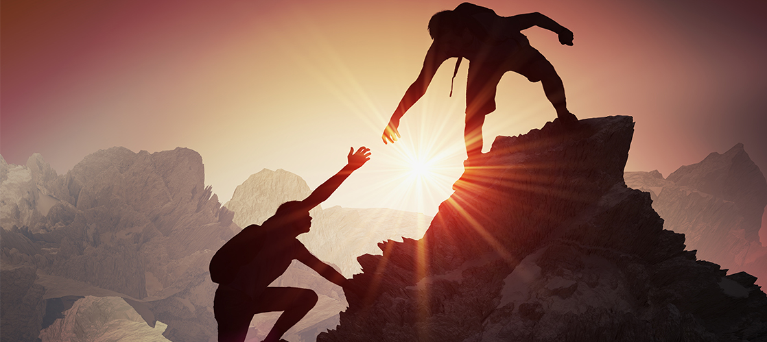 Hikers climbing up mountain cliff and one of them giving helping hand