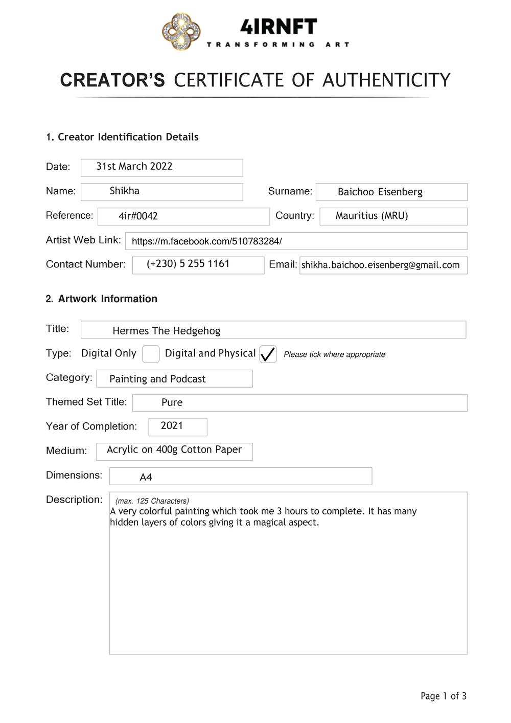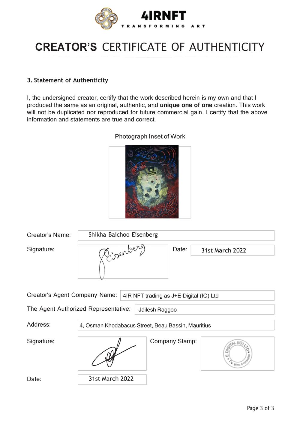 Certificate of Authenticity and Consignment Hermes The Hedgehog