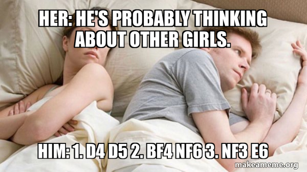 Her: HE #39 S PROBABLY THINKING ABOUT OTHER GIRLS Him: 1 d4 d5 2 Bf4 Nf6