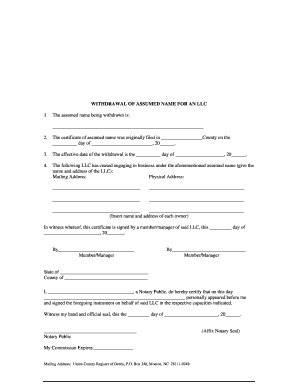North Carolina Withdrawal of Assumed Name Certificate Fill Out Sign