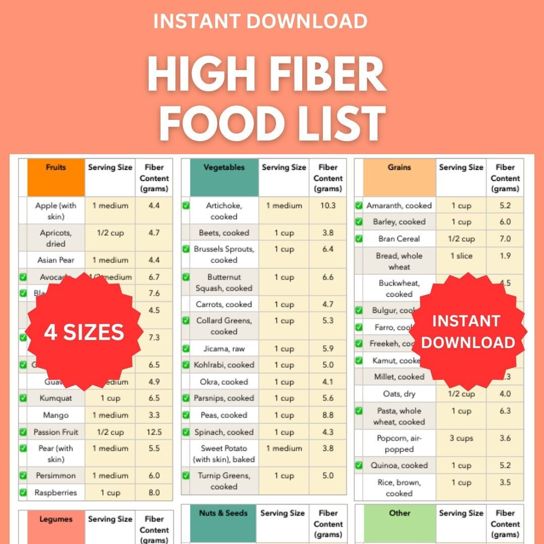 High Fiber Foods List: Printable Food Chart (digital Download) Etsy