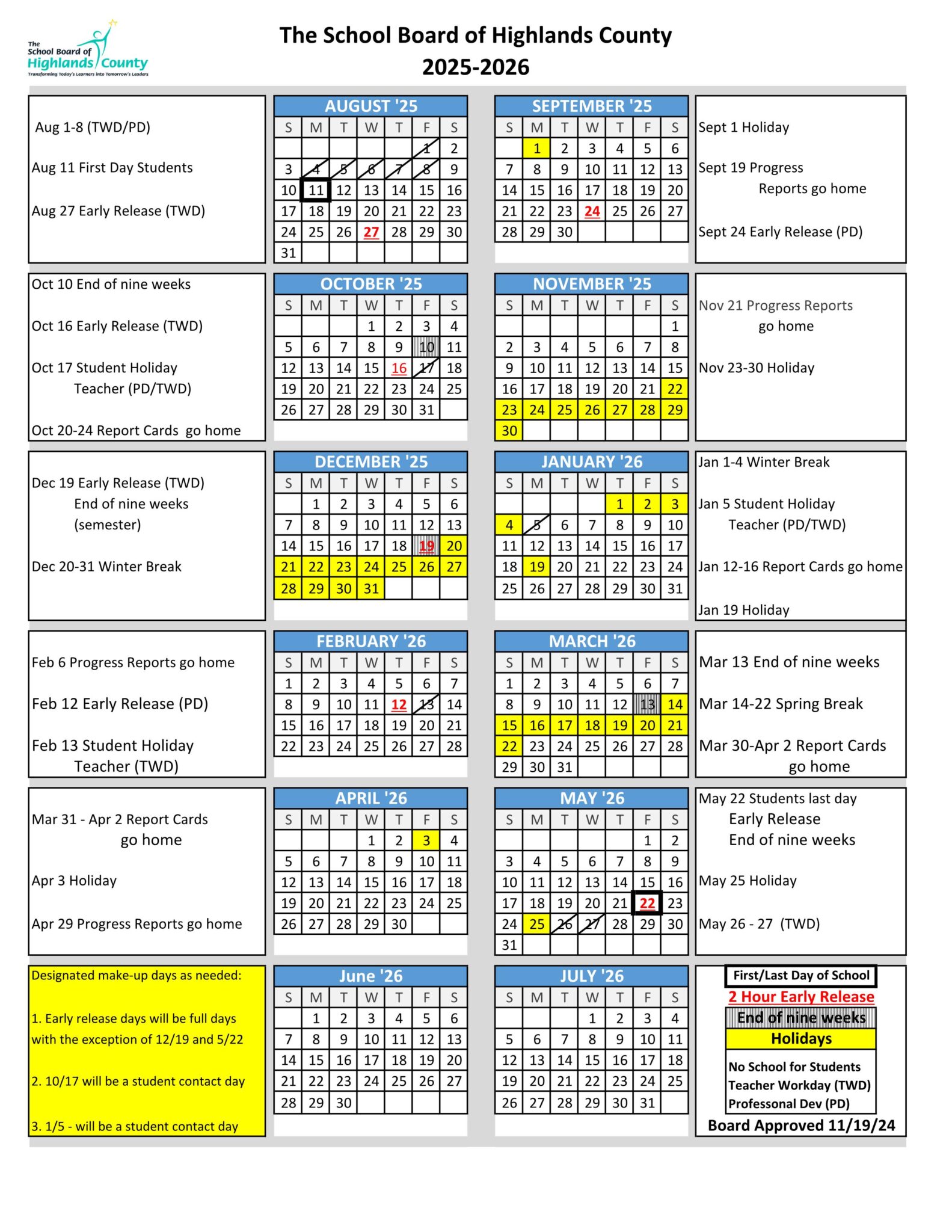 Highlands County Schools Calendar 2025 2026 in PDF School Calendar Info