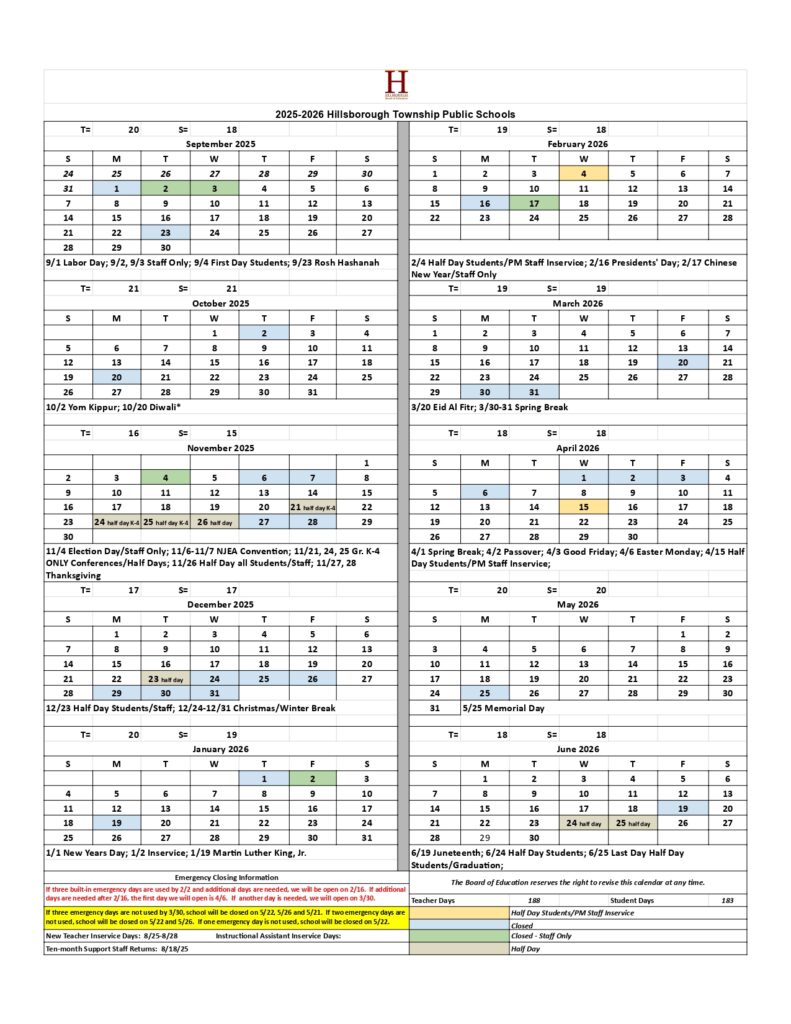 Hillsborough Township Public Schools Calendar 25 26 PDF Revised