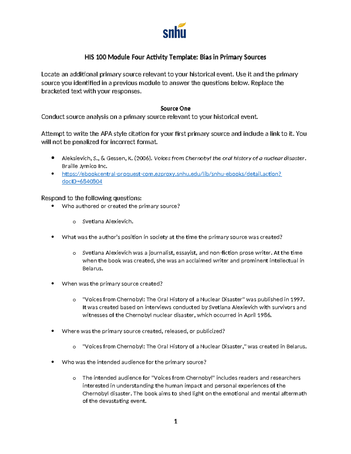 HIS 100 Module Four Activity Template Bias in Primary Sources DOCX