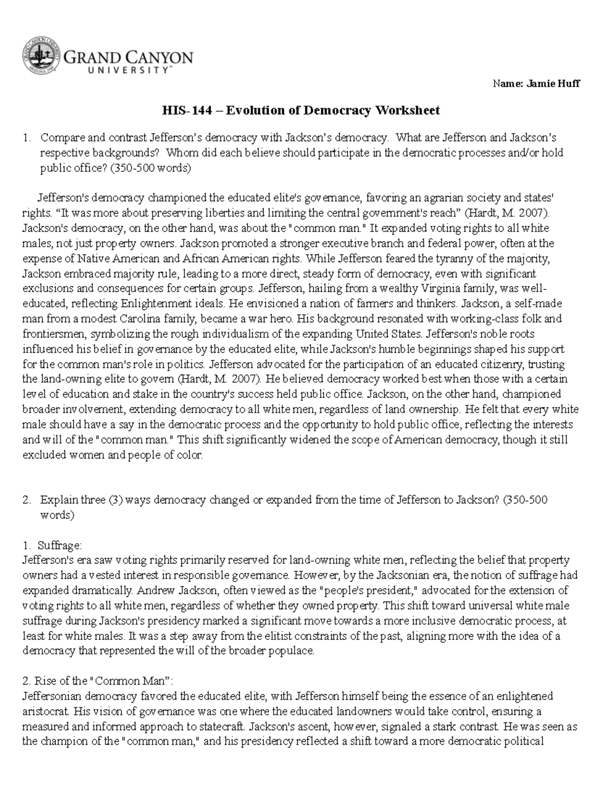 HIS 144 Evolution of Democracy Wroksheet Name: Jamie Huff HIS 144
