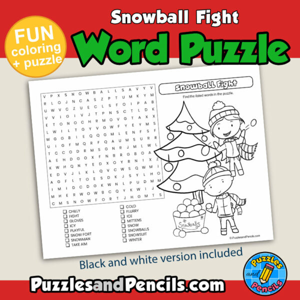 Snowball Fight Word Search Puzzle Activity Page with Coloring Winter