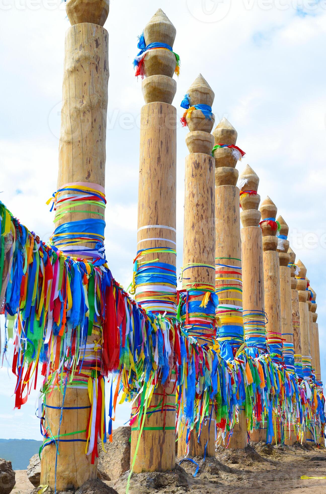 Hitching posts with ribbons of shamanism religion in Khuzhir island