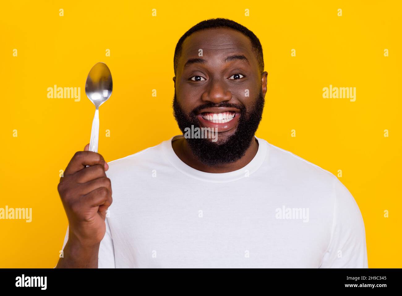 Portrait of funky satisfied person hand hold spoon toothy smile look
