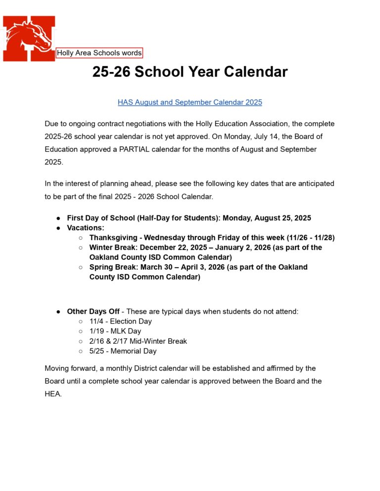 Holly Area Schools Calendar 2025 2026
