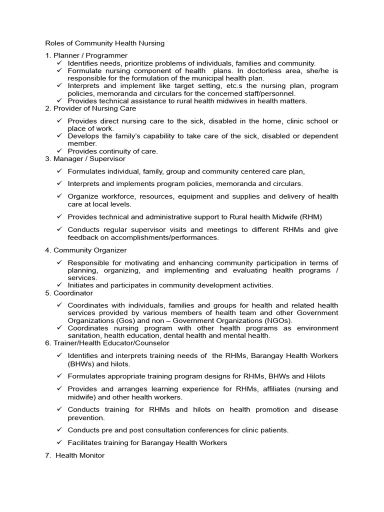 Roles of Community Health Nursing PDF Nursing Health Professional