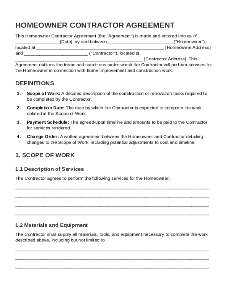 HOMEOWNER OR CONTRACTOR AGREEMENT Free Download