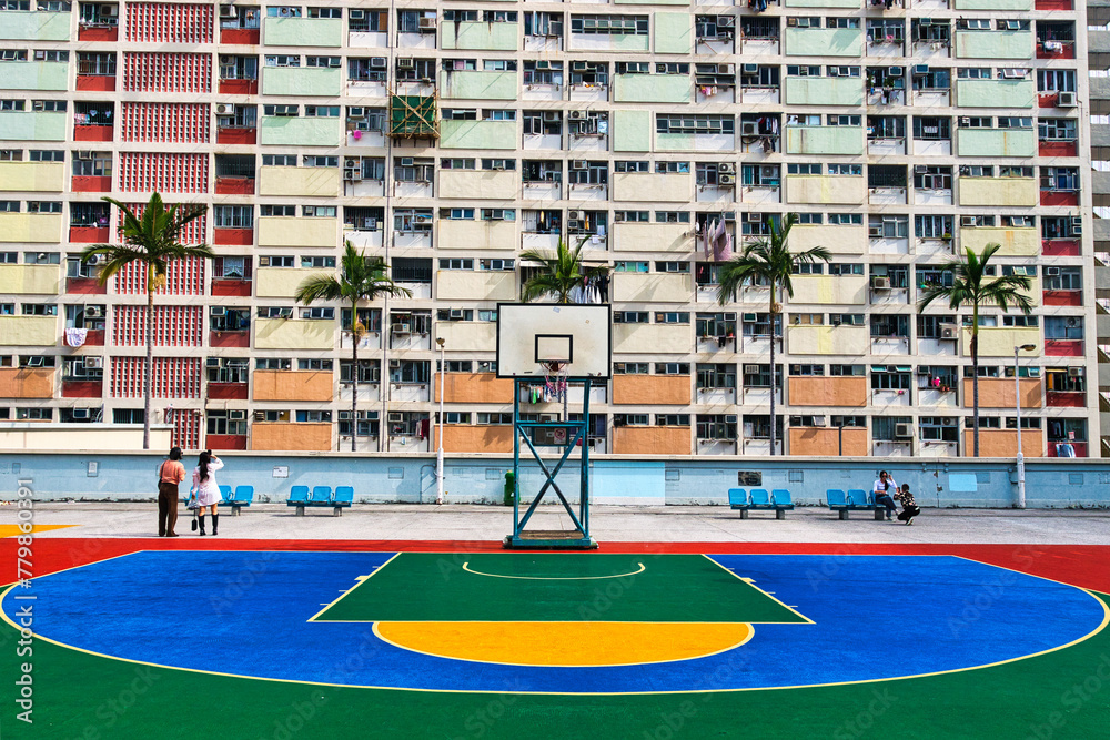 Choi Hung Estate Colorful Basketball Court in Hong Kong Stock Photo