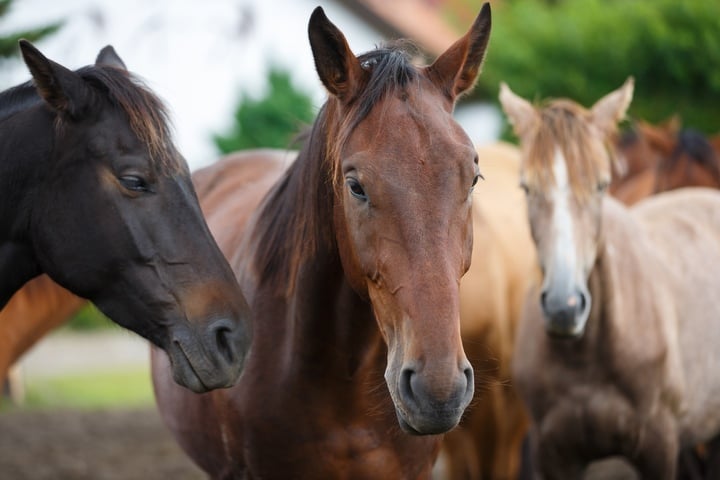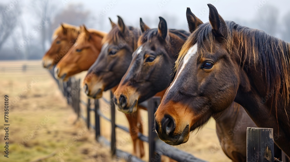 lineup of horses horses putting their heads together equestrian