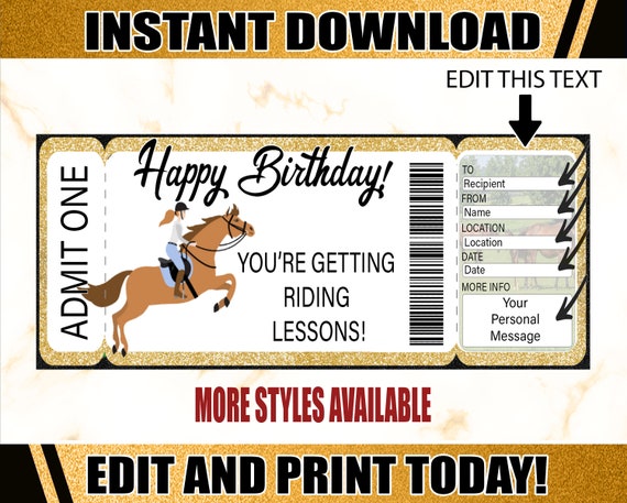 Horseback Riding Gift Certificate Ticket Printable Birthday Etsy