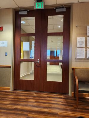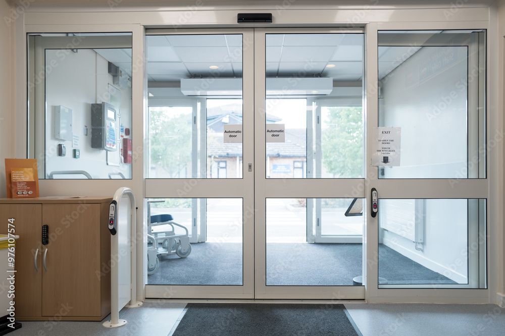 Automatic doors seen at the exit of an NHS outpatients department in a