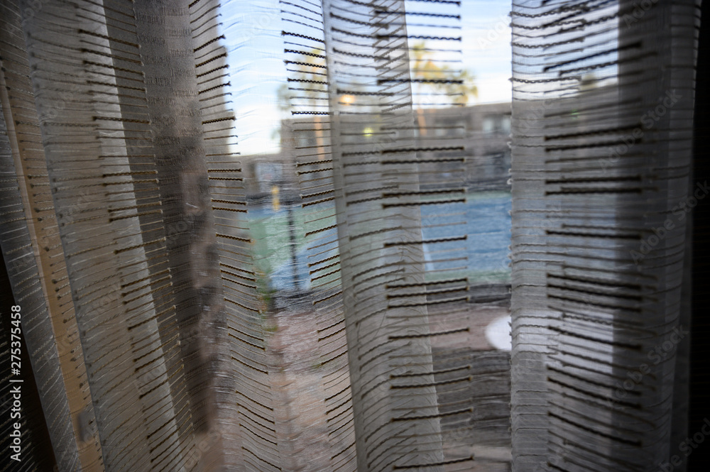 Looking through stripped window shades at a hotel basketball court