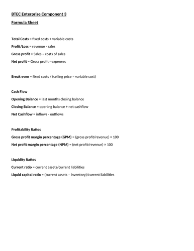 BTEC Enterprise Component 3 Formula Teaching Resources