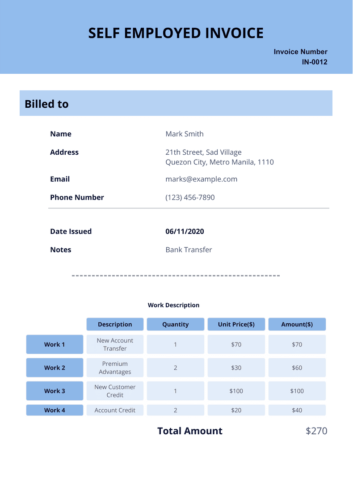 Self Employed Invoice Template Blank in PDF Excel Word