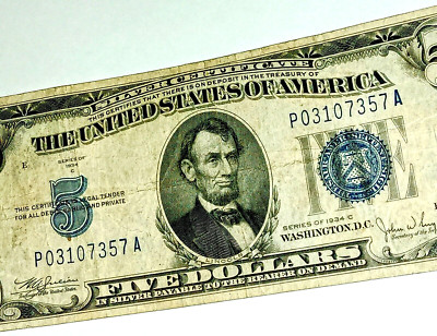 1934C Blue Seal $5 Dollar SILVER CERTIFICATE US Five Dollar Banknote