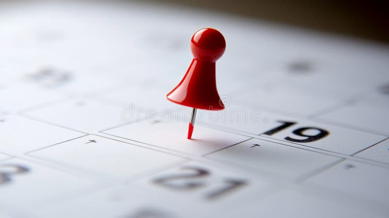 Vibrant Red Pushpin Marks Date on Calendar in Close Up Focus Image