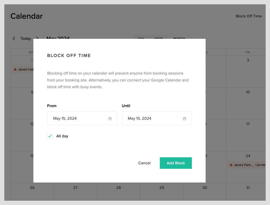 How do I block off time across all my session types? Pixieset Help