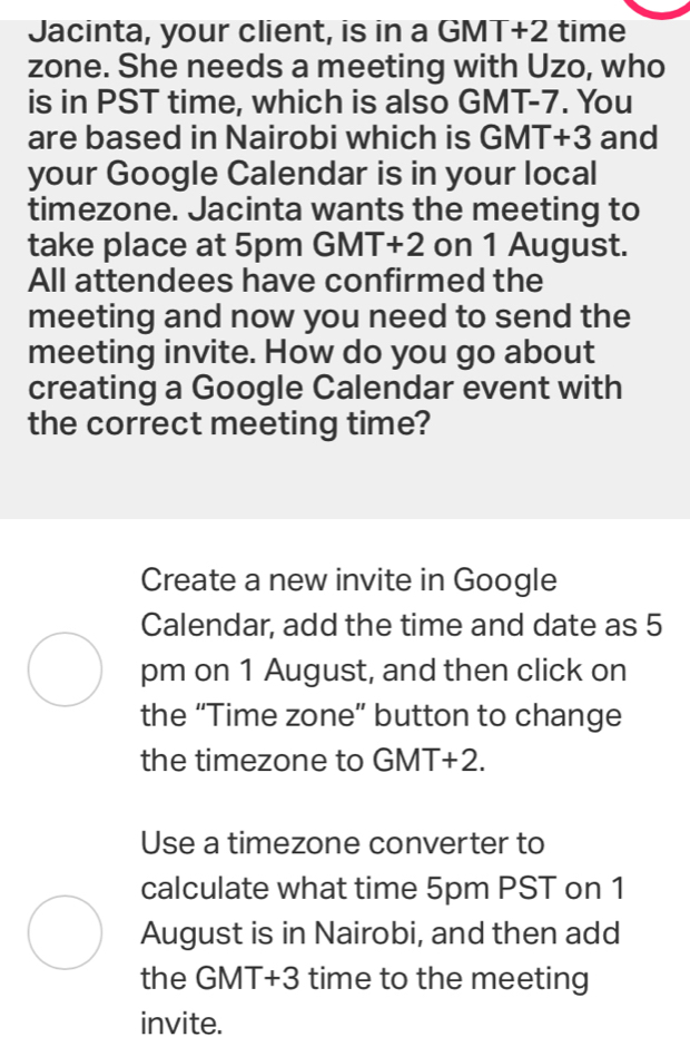 Solved: Jacinta your client is in a GM T 2 time zone She needs a