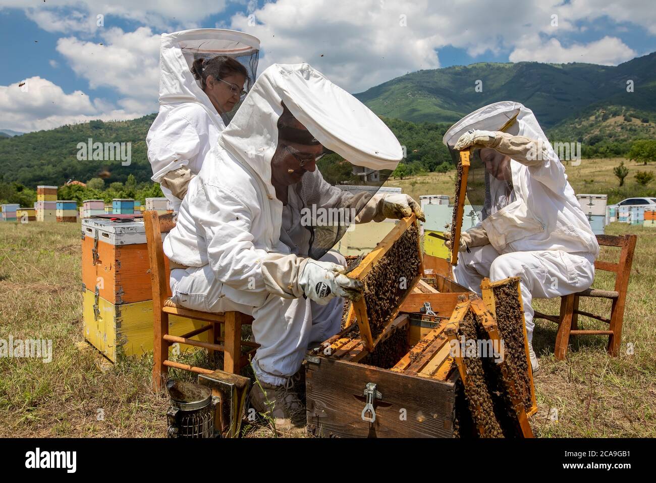 Florina Greece July 10 2020: Beekeepers working to collect honey in
