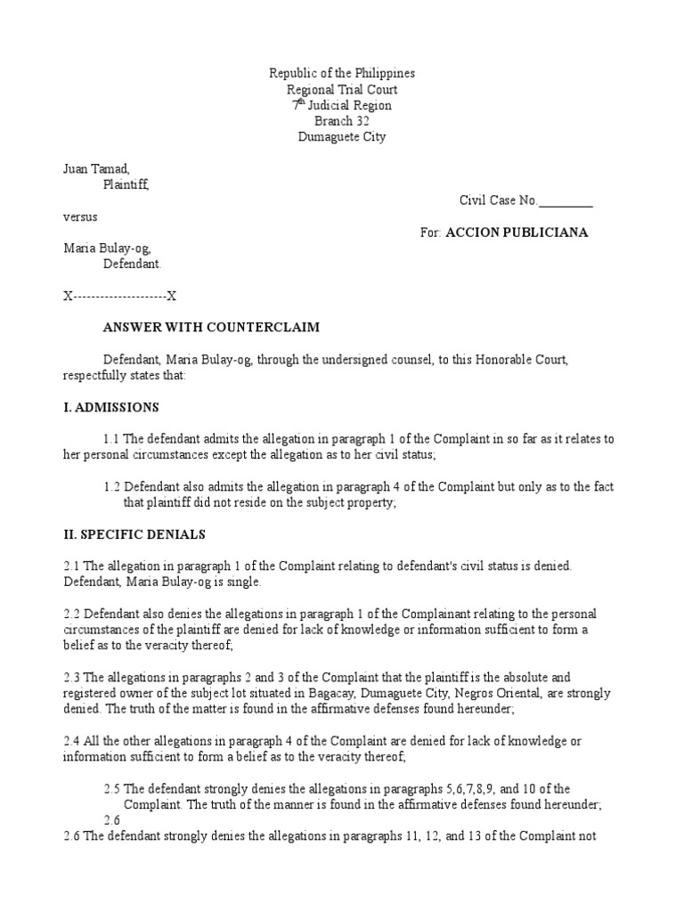 ANSWER With Counterclaim PDF Lawsuit Common Law