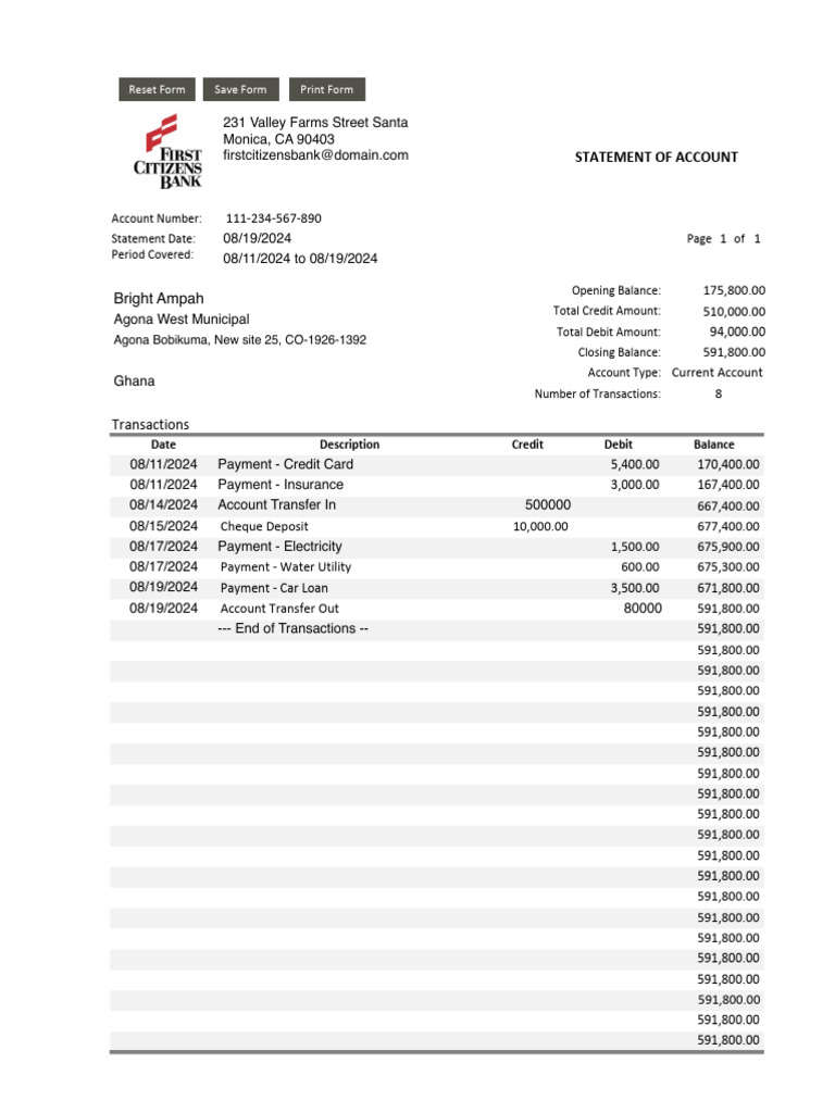 Bank statement template in Word and Pdf formats