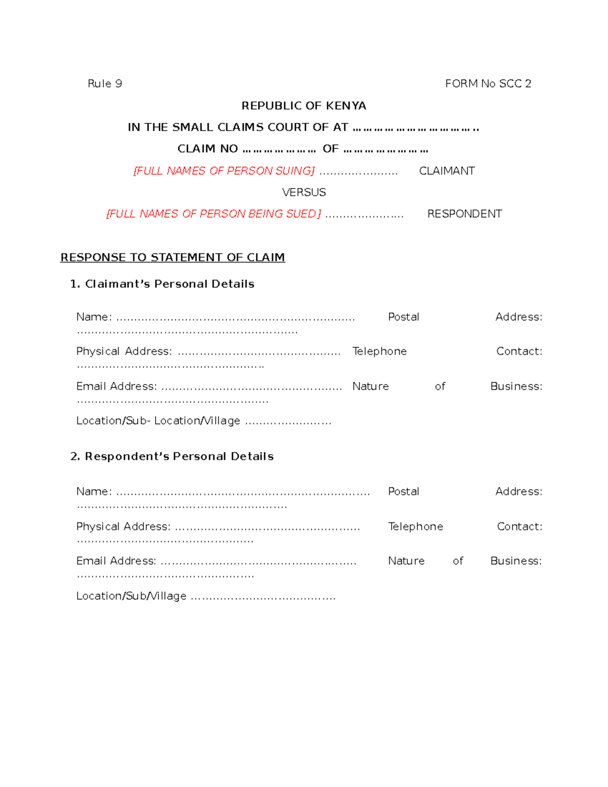 Small Claims Court Response To Statement Of Claim Rule 9 FORM No SCC