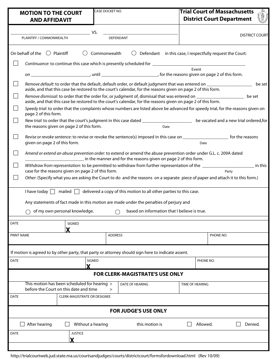 Massachusetts Motion to the Court and Affidavit Download Fillable PDF