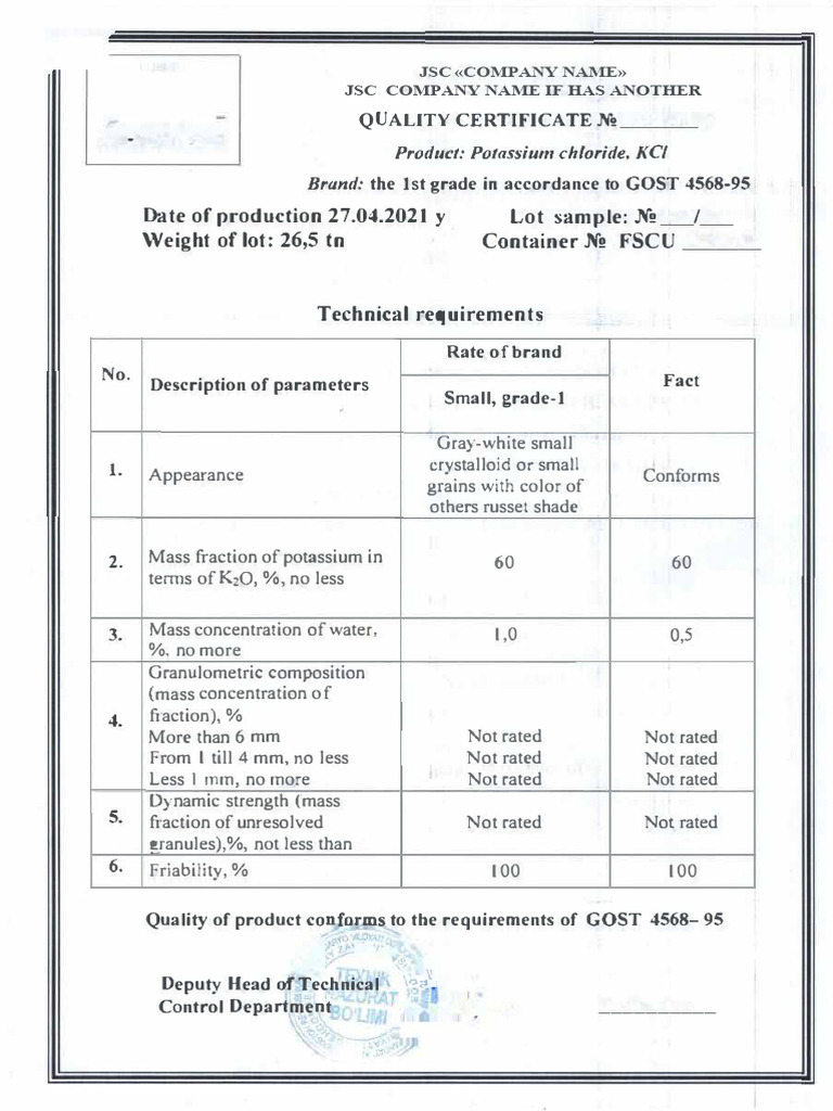 Certificate Sample of Potassium Chloride (KCL) in CIS Countries PDF