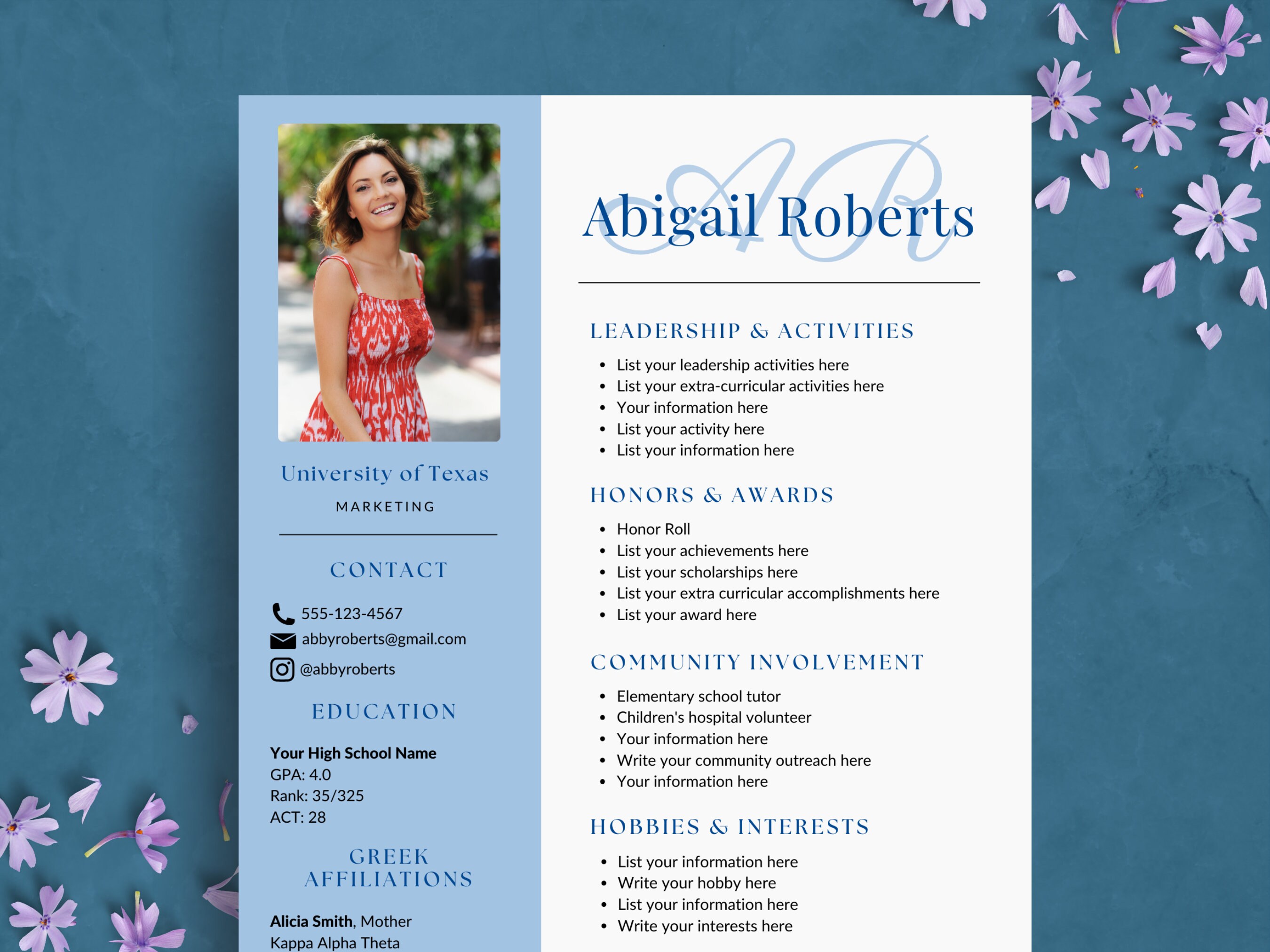 Blue Sorority Resume Template Editable Sorority Recruitment Rush