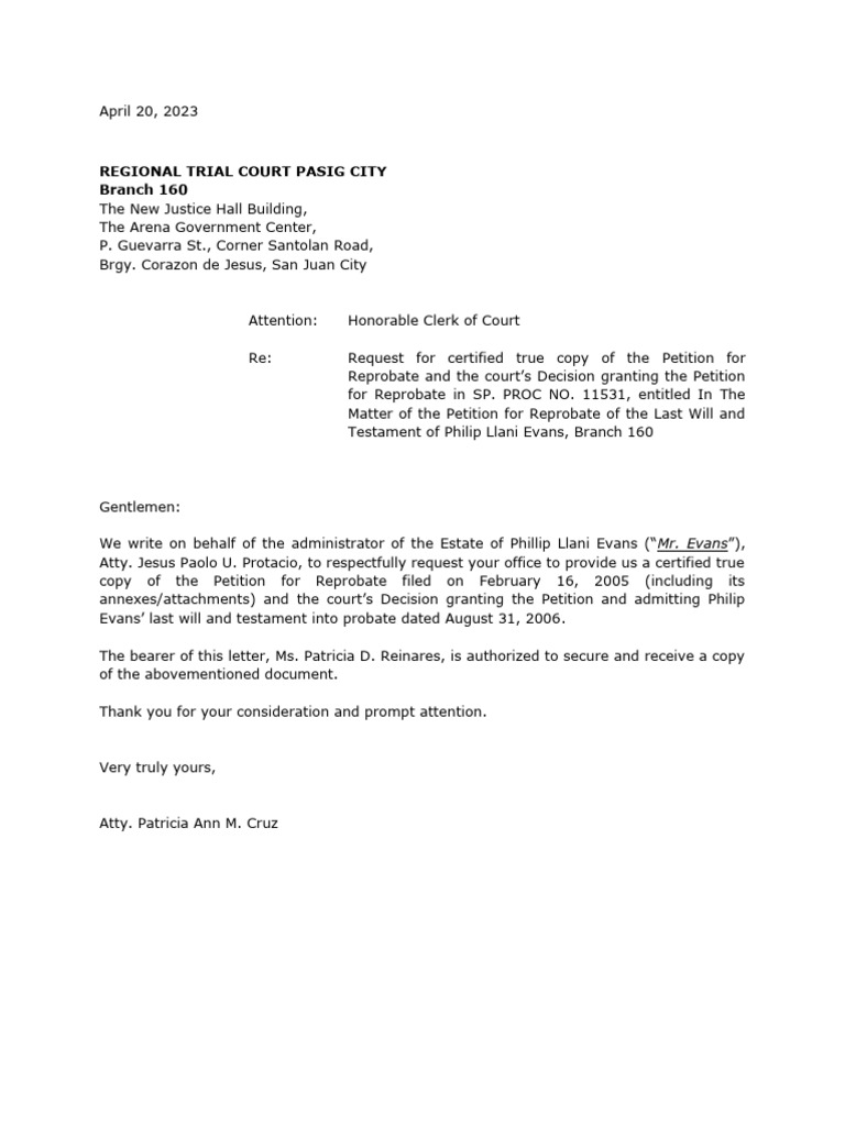 (28 4 1) Draft Letter Request For CTC of Petition and Decision RTC
