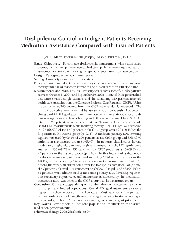 (PDF) Dyslipidemia Control in Indigent Patients Receiving Medication