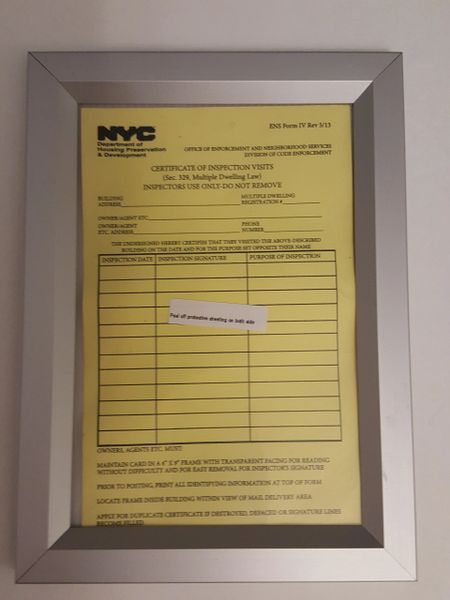 HPD CERTIFICATE OF INSPECTION FRAME (INSPECTION FRAMES 6X9)