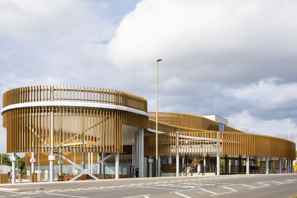 Trapezoidal fins create a dynamic façade for Arle Court Transport Hub