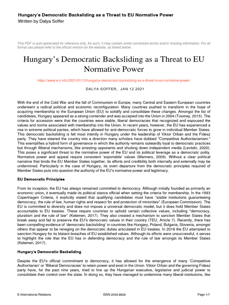 Hungarys Democratic Backsliding As A Threat To EU Normative Power PDF