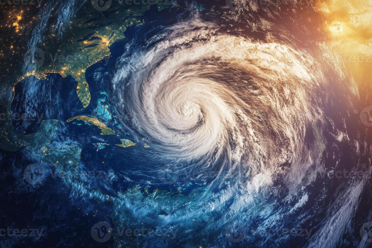 Aerial view of a powerful hurricane storm swirling over the Atlantic