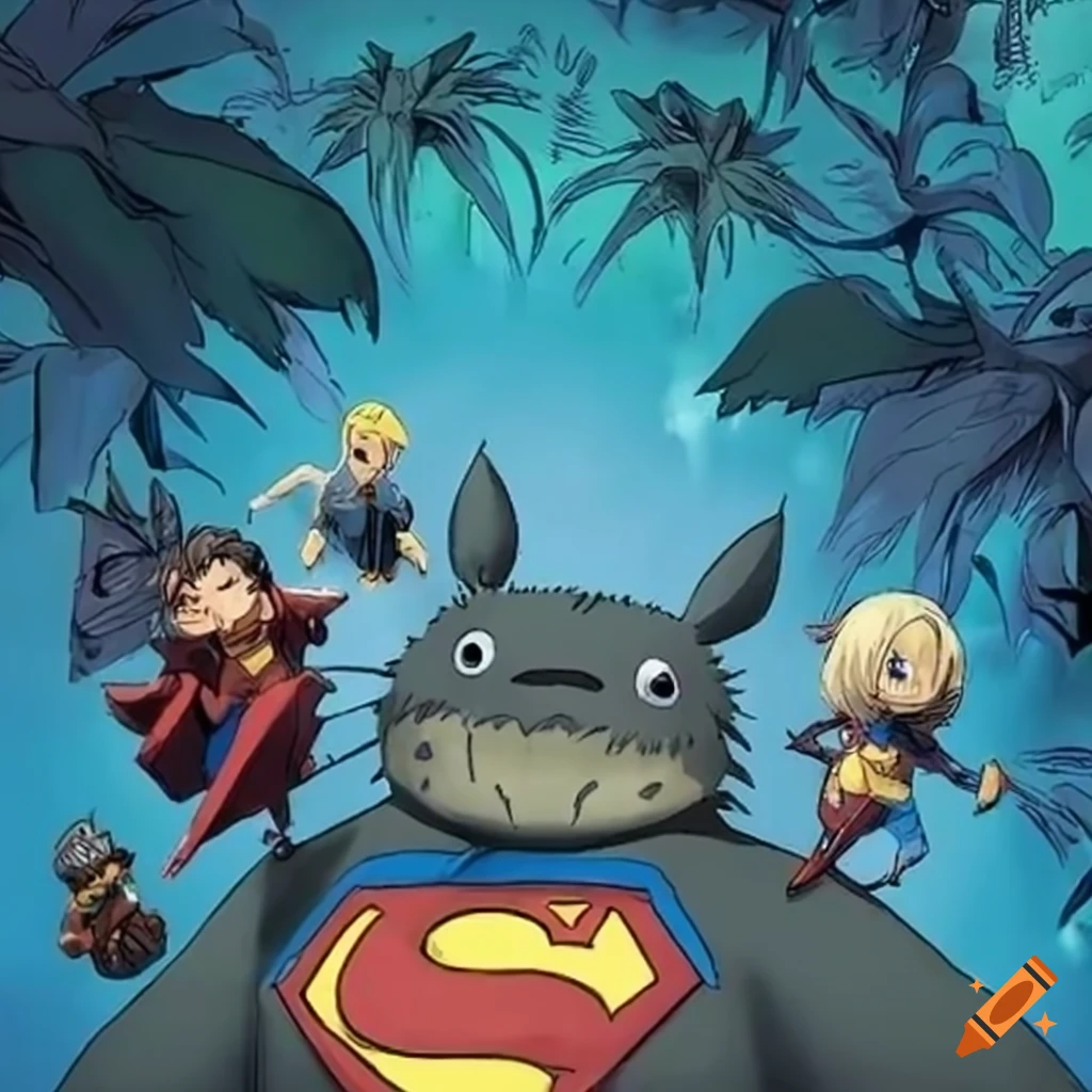 Artwork of a totoro superman hybrid fighting hackers on Craiyon