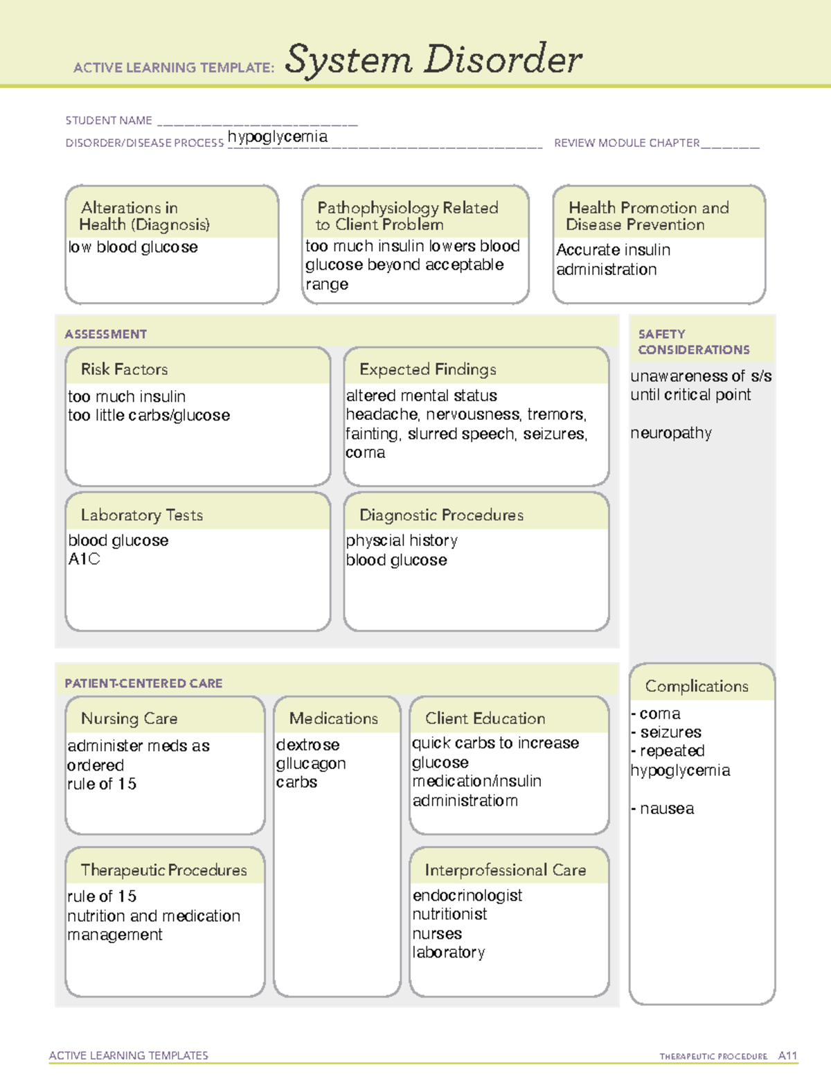 Hypoglycemia ACTIVE LEARNING TEMPLATES System Disorder STUDENT NAME